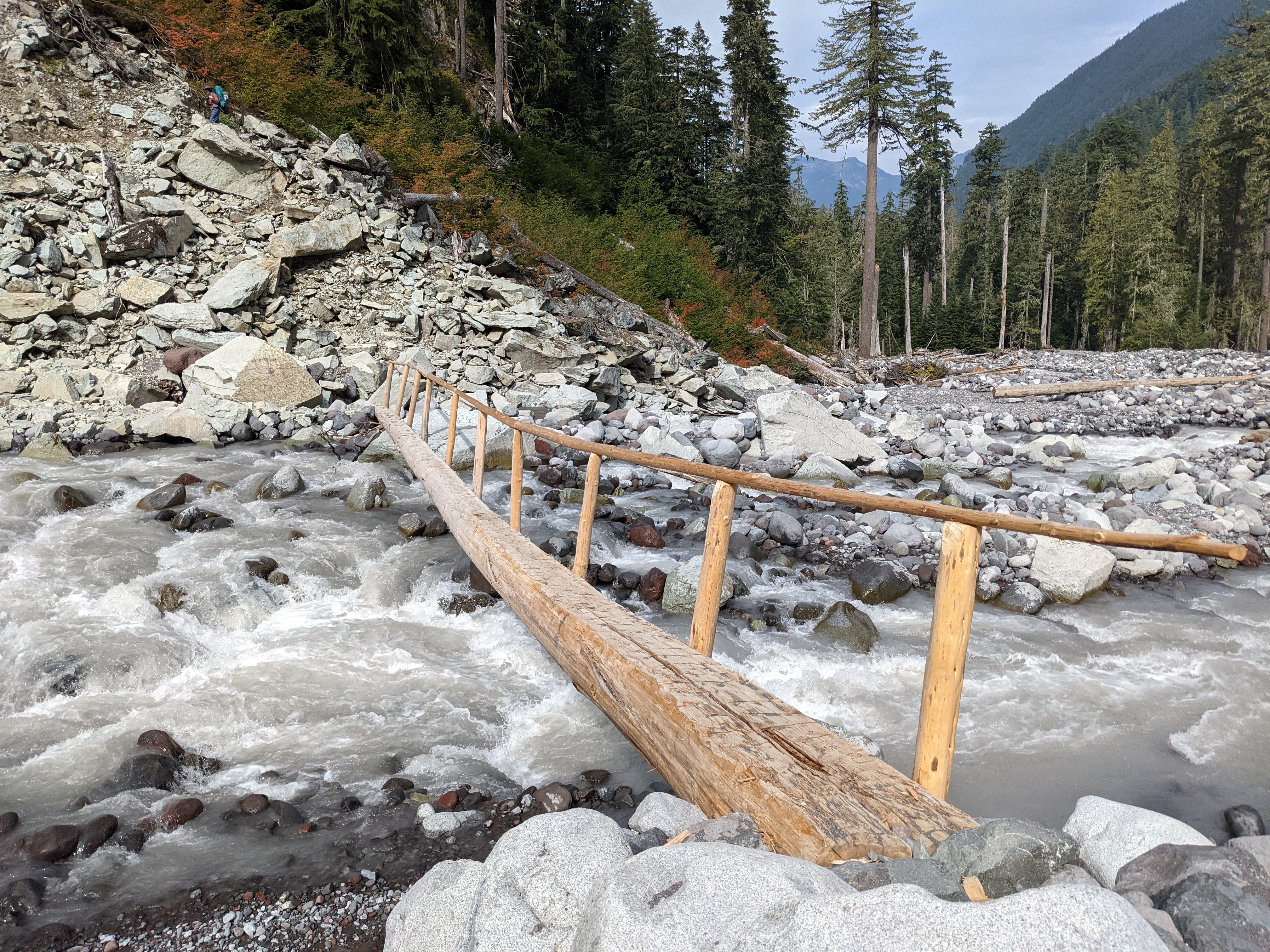 This is a log bridge for hikers to cross the river. There is a hand rail to make it easier to walk on. Even though it is made out of a tree trunk, it is long enough that it bounces when you walk over it.