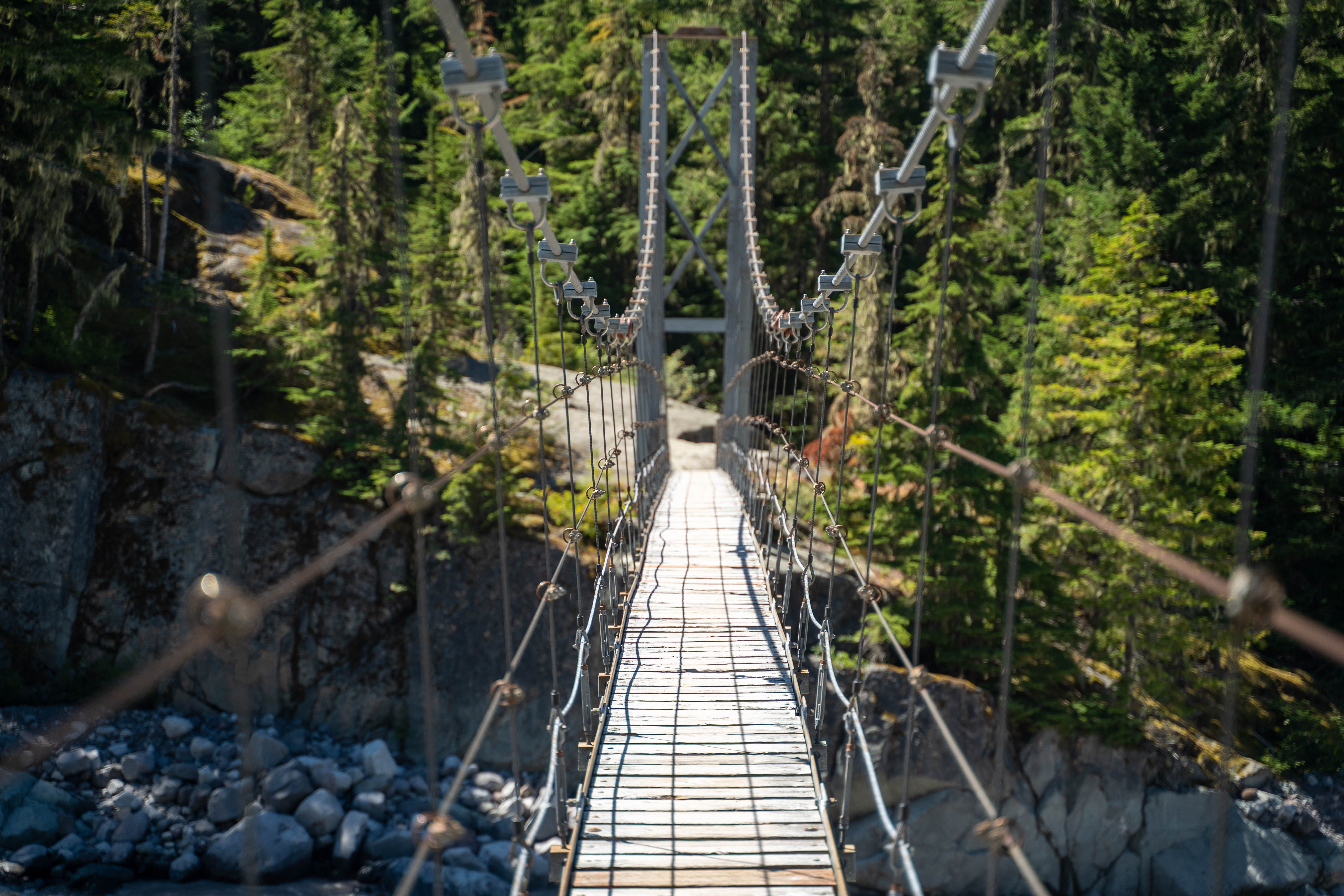This suspension bridge allows hikers to cross over a river. This part of the river is too wide for a log bridge.