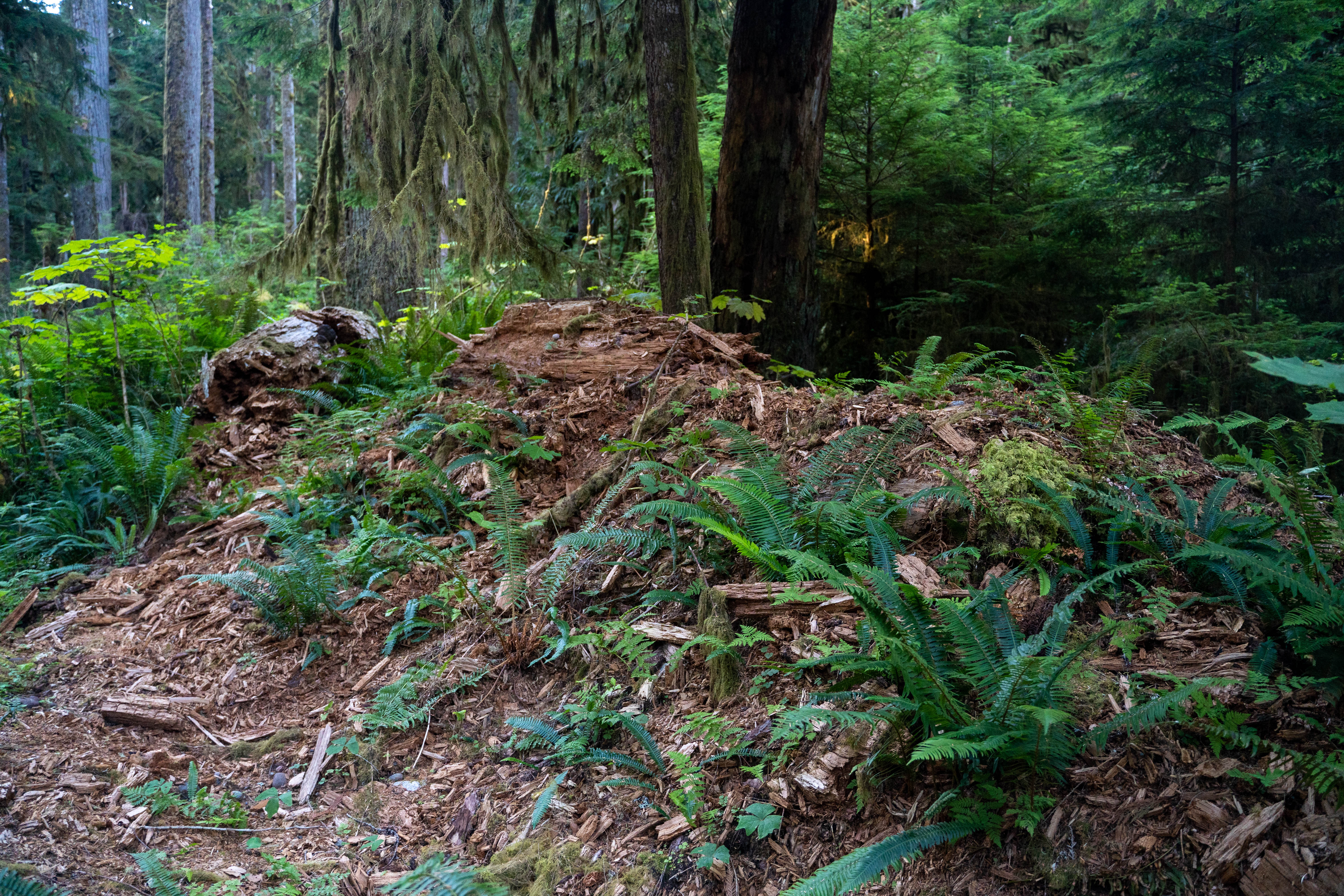 This fallen tree was broken down by moisture, insects, bacteria, and fungi. Now it is a habitat for ferns and provides nutrients for the temperate rainforest.