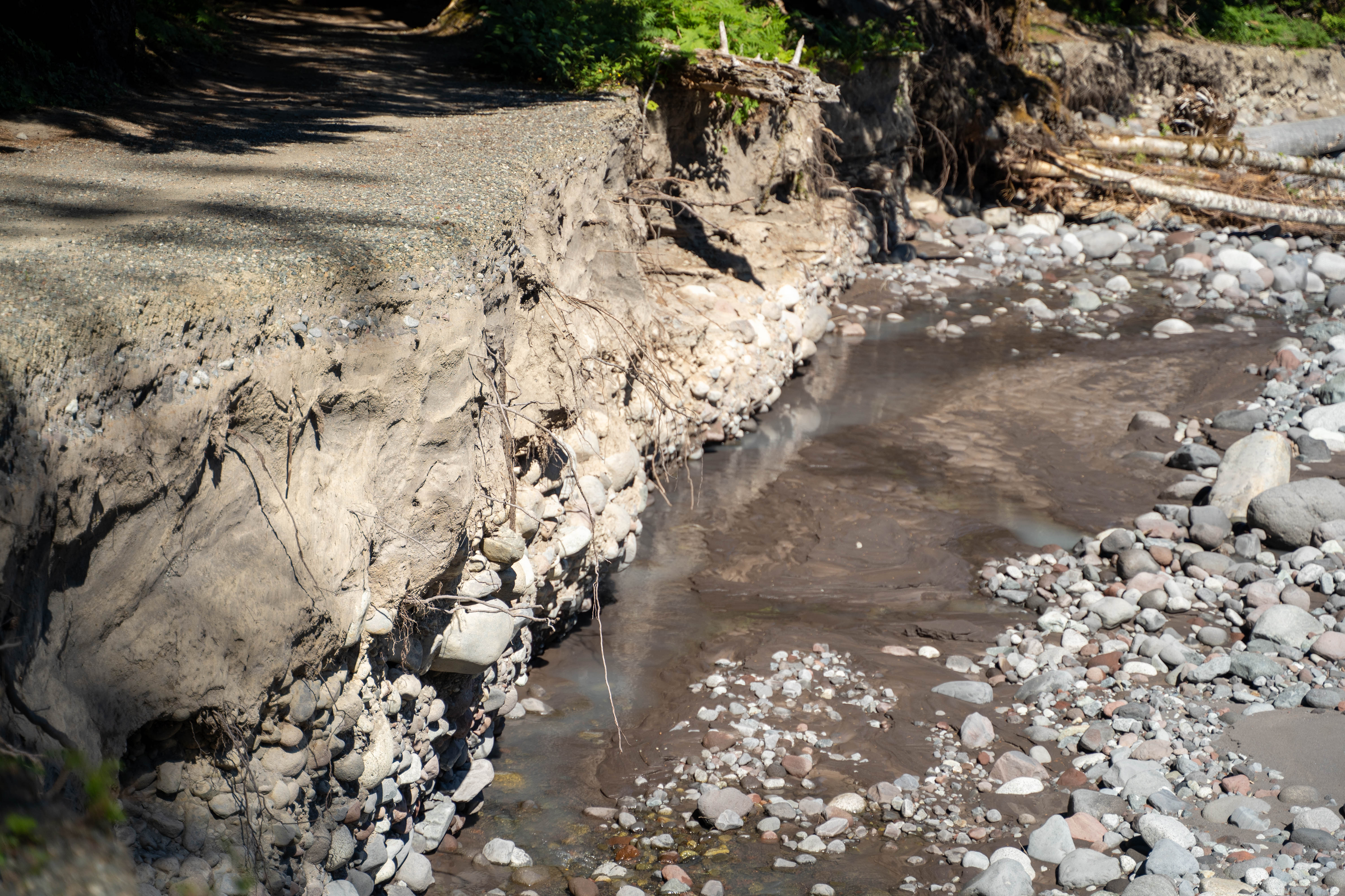 This is another place where erosion has destroyed part of a road. You can see the layers of soil and rock that were under the road when it was built.