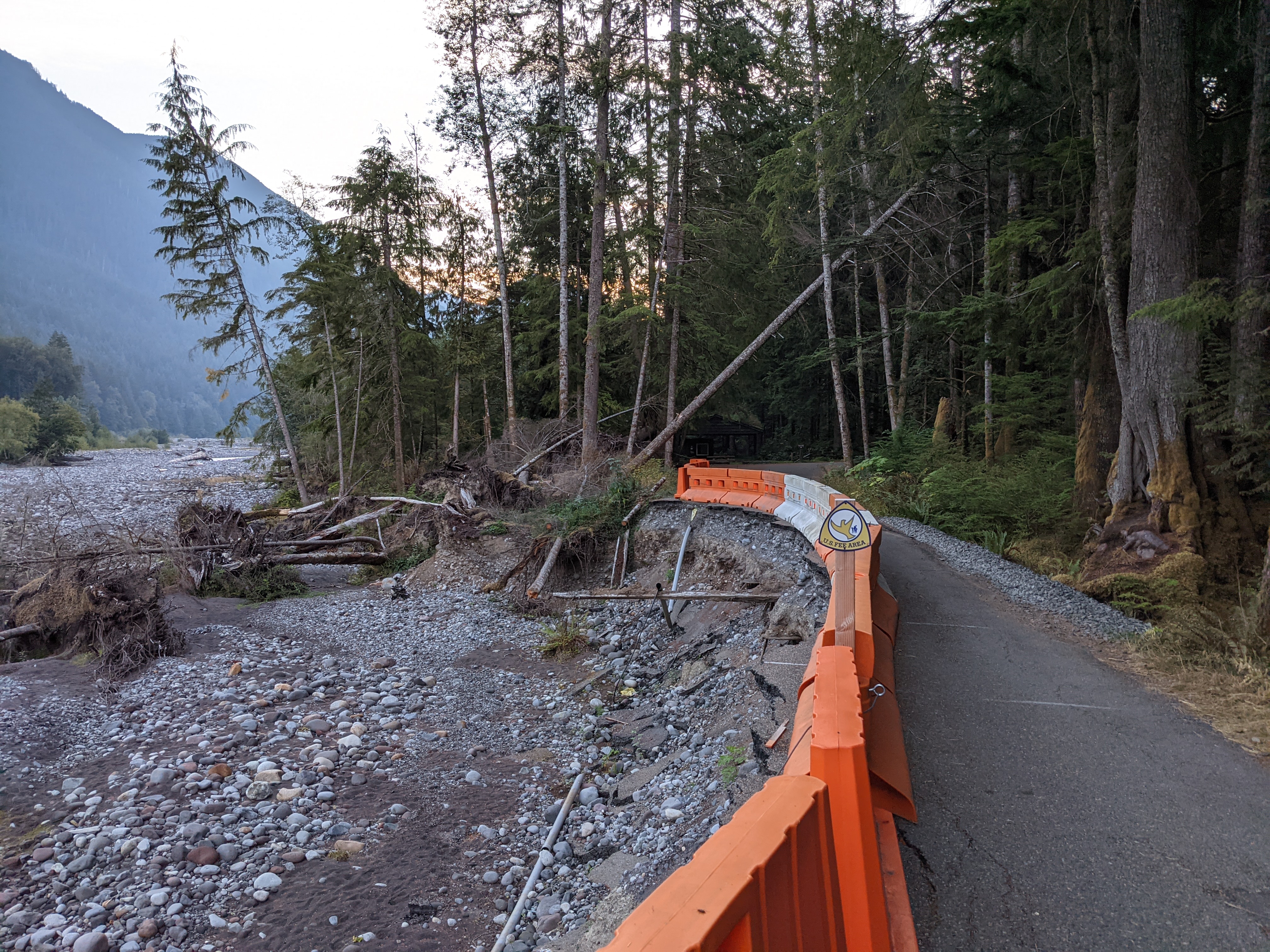 Cars can't go past the Carbon River Entrance at Mt. Rainier anymore because of erosion. The road was built near the river, and a big storm made the river carry away so much soil under the road that about half of this part of the road fell into the river. This part of the road used to fit two cars side by side.