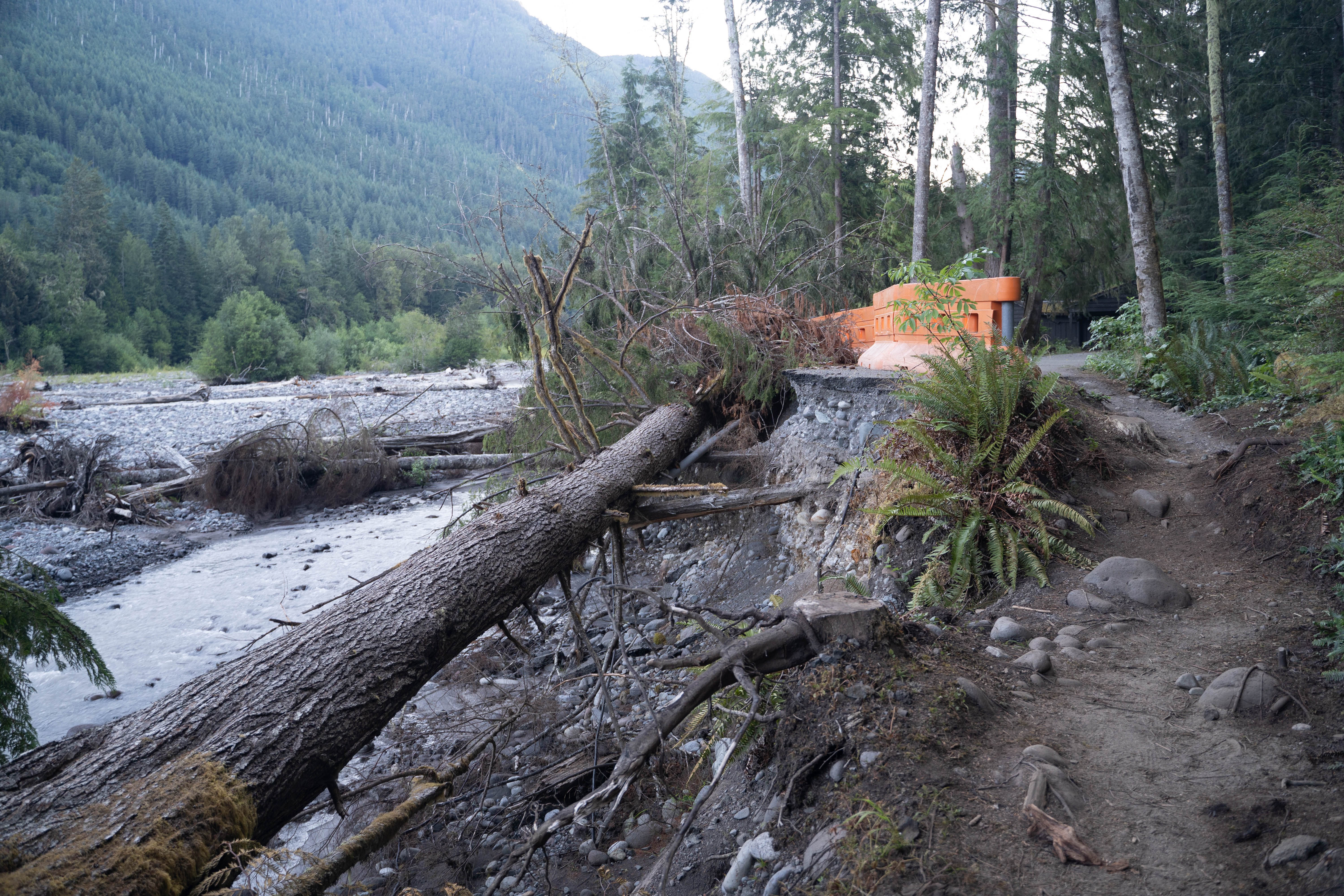 Cars can't go past the Carbon River Entrance at Mt. Rainier anymore because of erosion. The road was built near the river, and over a few years, the river has carried away so much soil under the road that it has been destroyed.