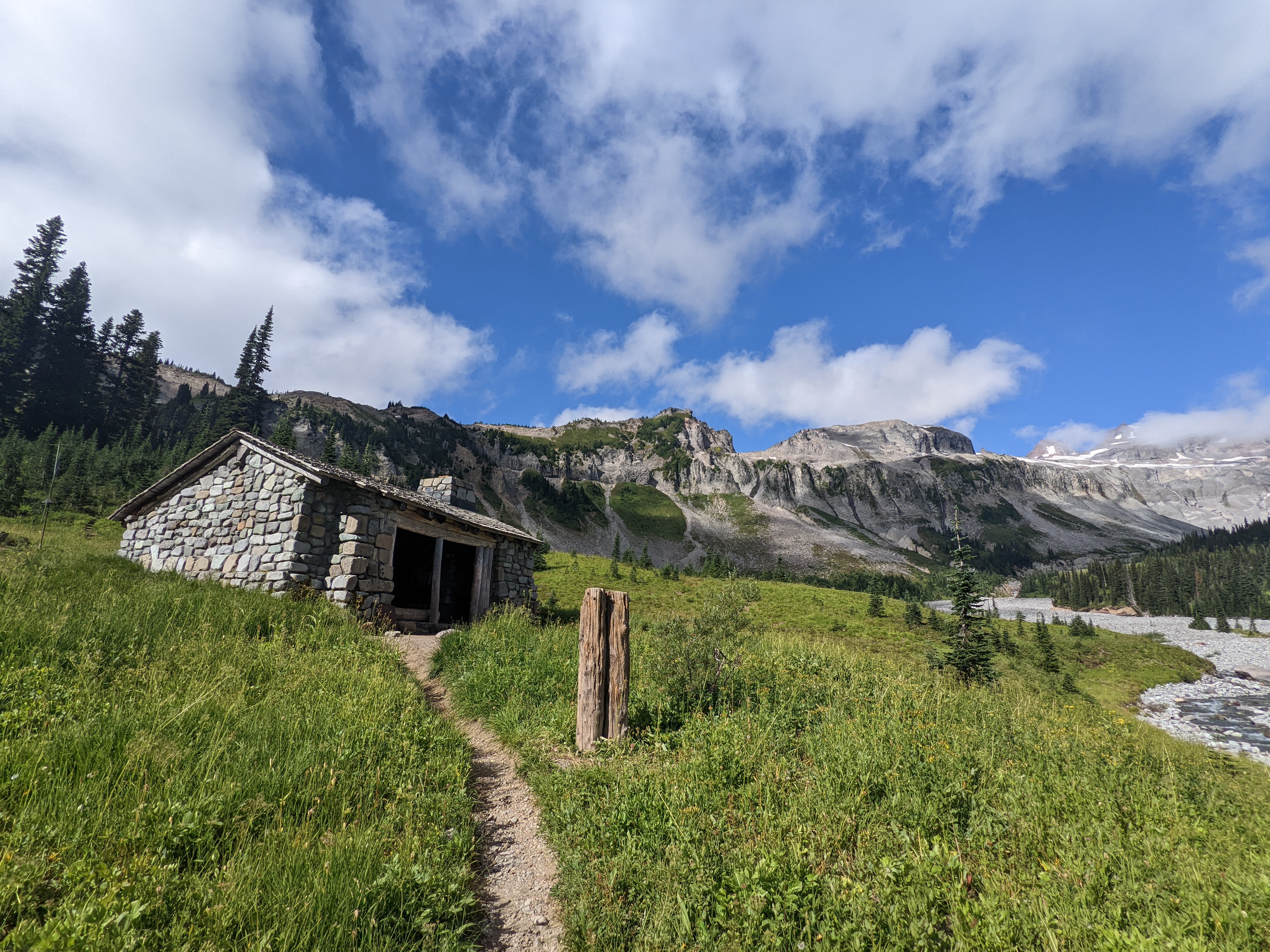 This shelter was built more than 80 years ago. It lets a group of hikers on an overnight trip stay safe from wind and rain. This is important because tents can damage the fragile meadow.