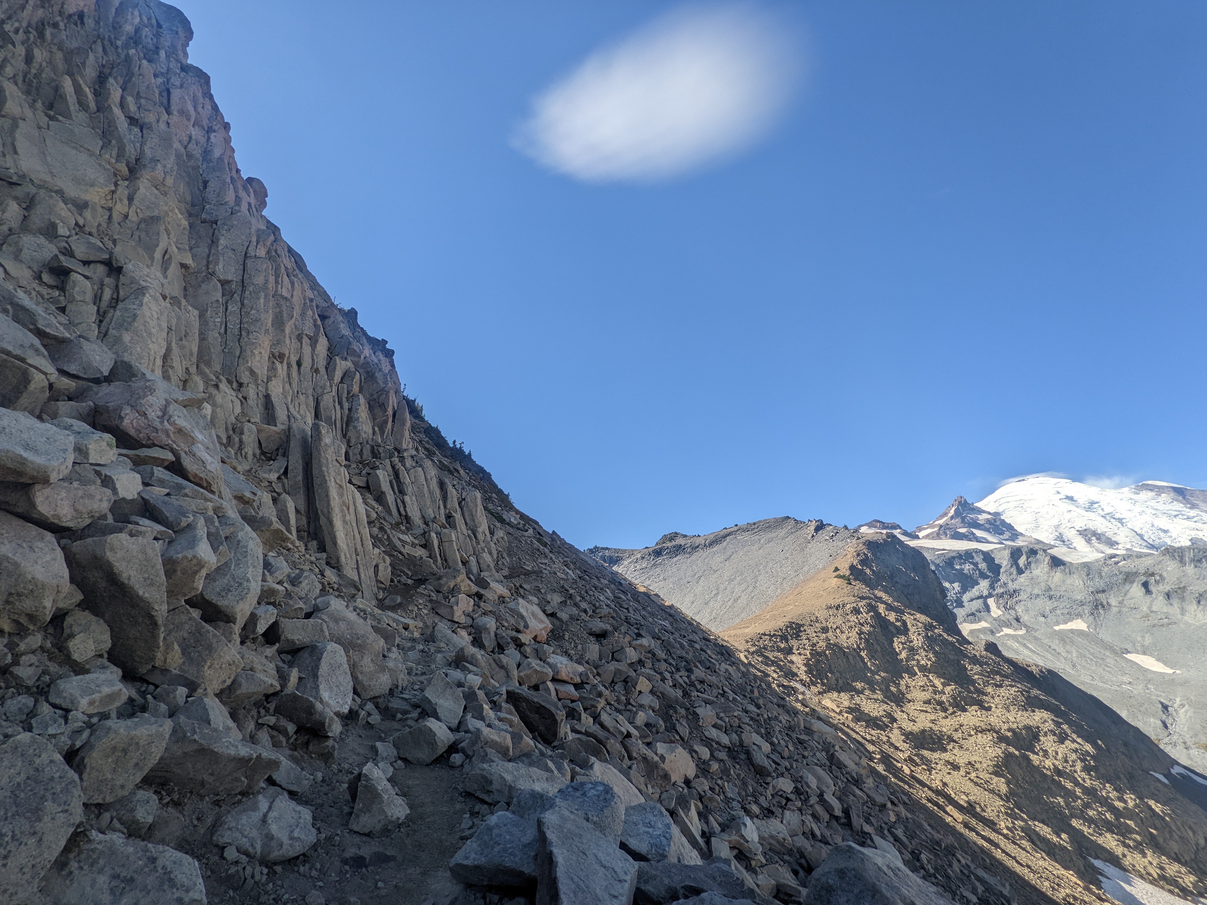 You can see some rock columns on the left. They formed when lava cooled down, shrank, and cracked.