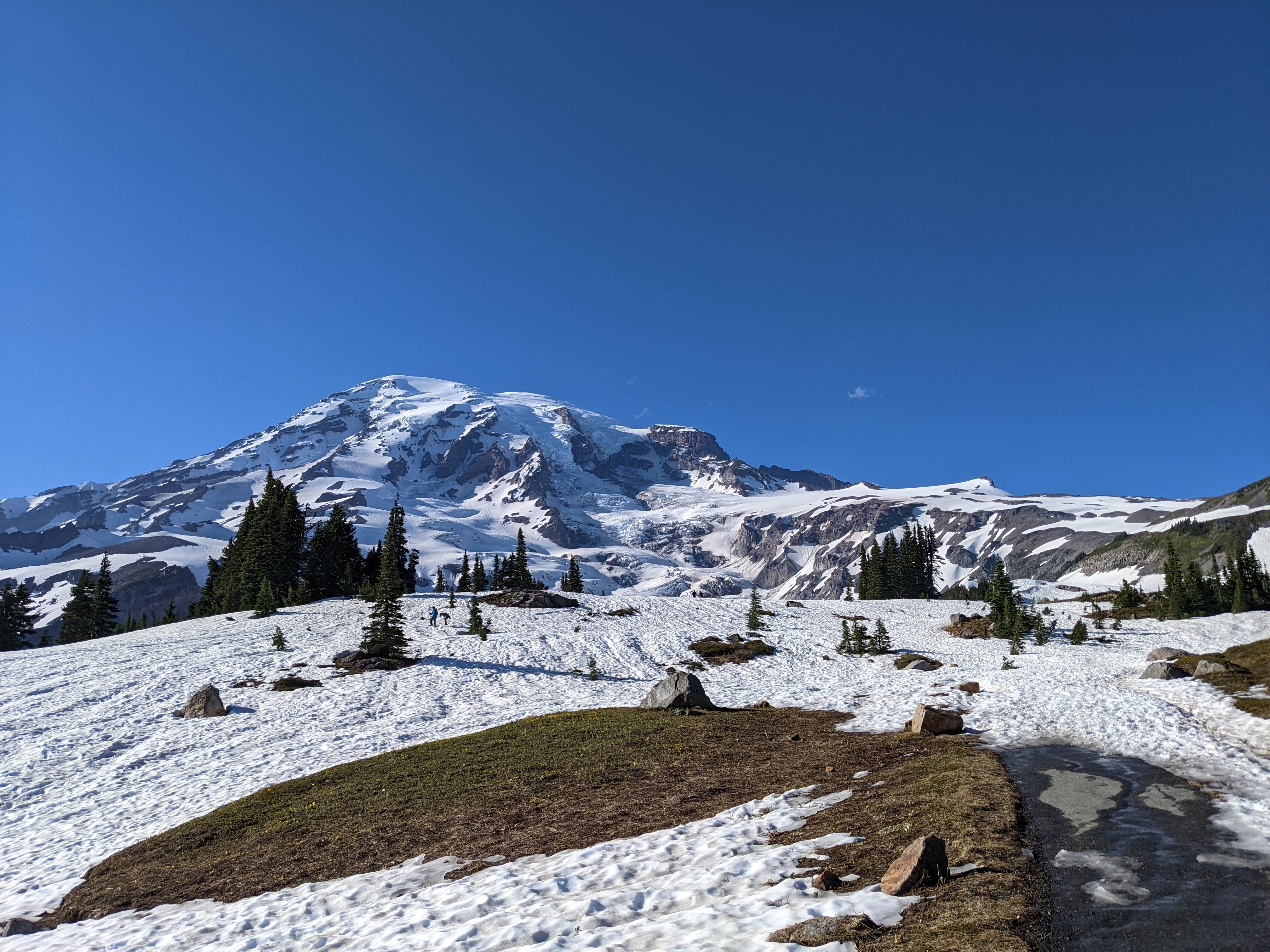 Paradise is the most popular place to visit on Mt. Rainier. In July, about half of the snow has melted. People can go hiking, but they usually bring hiking poles and special spikes that can go on their boots so they don't slip.