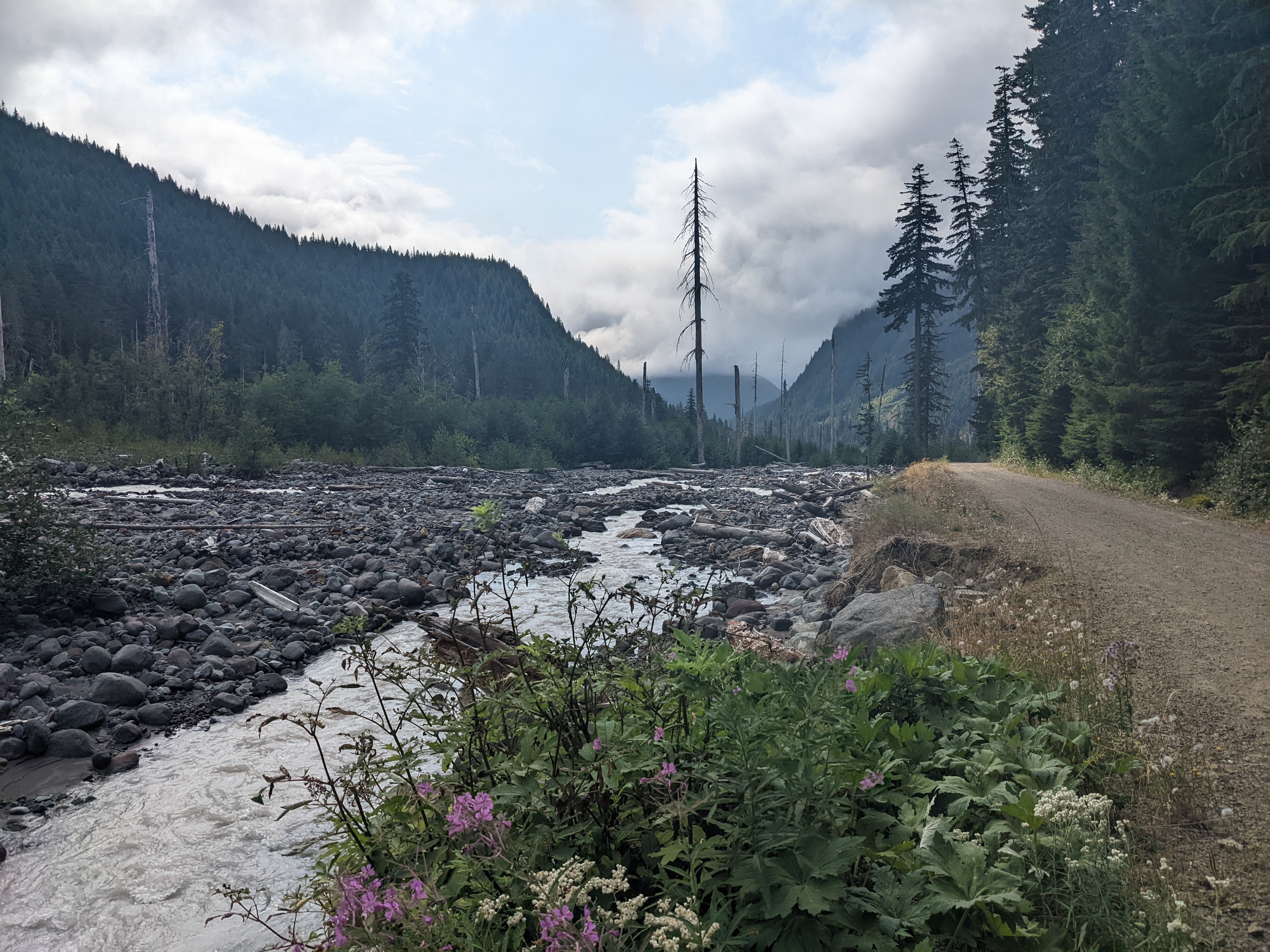 Tahoma Creek has moved very near to Westside Road. The water has eroded part of the road. It is not safe for cars anymore.